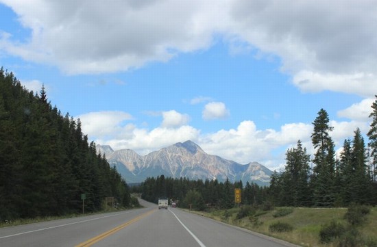 图29:沿93A公路行驶30多公里后,这条路重新又并回了93号公路。一上93号公路,迎面就看见了高大的“金字塔山”(Mt. Pyramid),今天的目的地贾斯珀小镇就在金字塔山下。因为没有游成Mt Edith,所以到达贾斯珀镇的时间比原来预计的提前很多,看来是要把明天的部分行程挪到今天下午了……