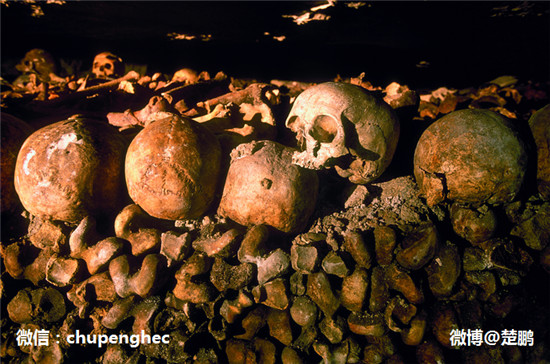 我惊讶地发现,墓穴里大腿骨被排列成了比较整齐的骨头墙,小骨头则用来填充,而头盖骨则在大腿骨组成的墙上镶了几道边。还有一部分人骨被排列成心形、门框形和十字架形,甚至还堆砌成洞穴、拱桥……