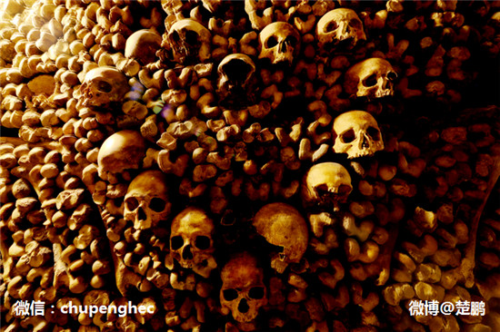 在这里,骨头好像是被用来作为艺术创作的素材,这些虔诚刻苦的教士在那么混乱的环境中,负担那么繁重肮脏沉闷的工作,竟然还有心思把人们的遗骨整洁优雅地拼成一幅幅接近图案的形状!