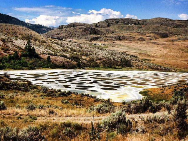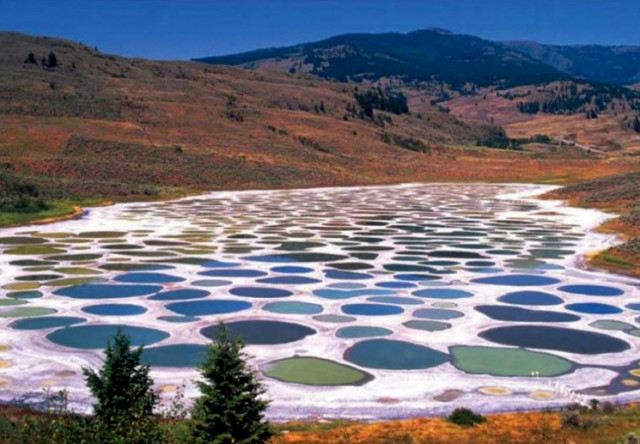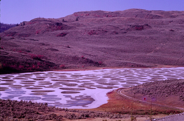 奥索尤斯(Osoyoos)的斑点湖(Spotted Lake)称得上是世界奇特自然景观之一。这里的湖水中因为含有多种高浓度的矿物质,所以湖水的颜色会随着水温,水量、甚至是光线的变化而不断变化。无论你什么时候去都能看到漂亮的色斑,而且都会发现它的颜色与你上一次看到会不一样。这里是加拿大最热的地区之一,每年大约6月中旬到9月中旬,接连的高温天气不断让湖水蒸发,湖底的矿物质就会露出来,形成一个个白色、淡黄色、绿色和蓝色园圈。远远望去像一个个不规则的斑点,这也是斑点湖名字的由来。