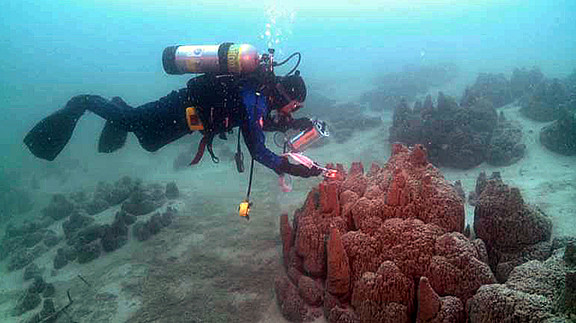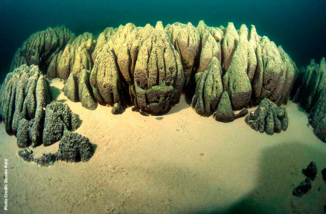 在BC省99号高速公路的沿途,在 Marble Canyon 省立公园里,有一座亭湖(Pavilion Lake)。这里的湖水透着神秘蓝绿色的斑纹,这是几亿年来在湖底的微生物形成各种类似珊瑚的沉积物的颜色。传说这里隐藏着地球生命起源的秘密(没准还有外星世界遗留下来的信息呢)。所以这里也成为美国国家宇航局,加拿大太空署和其他世界各地的生物机构的研究基地之一。