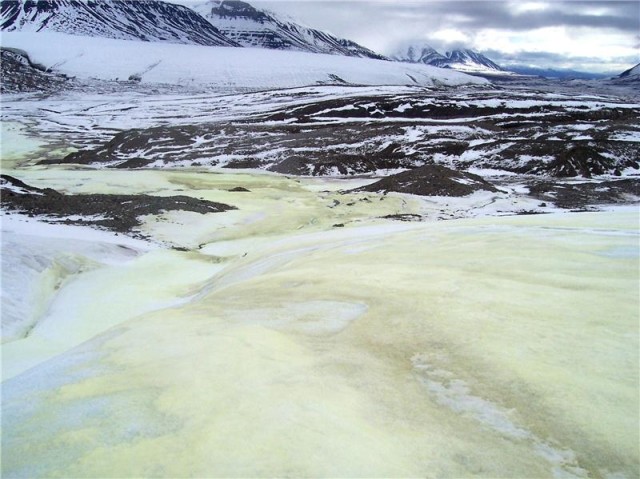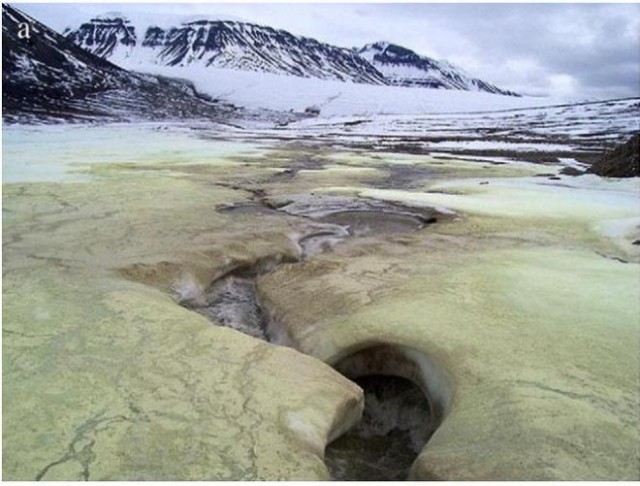 大量的水从冰川表面的裂隙中涌出,沉淀出大量的硫,石膏和钙华。空气重充斥着硫化氢的味道,这就是位于加拿大努纳武特地区埃尔斯米尔岛上(Ellesmere Island)博拉峡湾通道上的景象。独特的化学特性和极寒干燥的环境,使这里像极了火星和木卫二地下可能存在的水热系统,所以这里也成为了科学家们模拟研究木星卫星的最好场地。