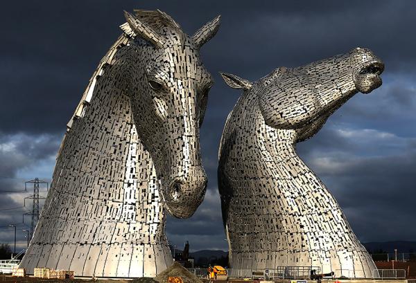 来自格拉斯哥的艺术家Andy Scott专门从事大型公共艺术设施设计。Kelpies一套两个马头组成的,坐落在福斯-克莱德运河边上。灵感来自于凯尔特民间传说中的神马 Kelpies。Scott以克莱兹代尔马为原型设计出了这对巨型马头。另外,这两座马头还有名字——Duke、Baron。Kelpies有10层楼那么高,如今已成为苏格兰的新地标性建筑物之一。