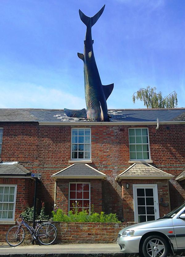 这座7.6米高的雕像也称《无题1986》。这座雕像最初被市议会视为异类,被要求拆除,但后来还是逐渐被人们所接受。作品在1986年完成,为了纪念美国向日本长崎投放原子弹的41周年。屋主请雕塑家John Buckley设计,并请当地的工匠完成了一只由金属、树脂和石膏做成的鲨鱼,让它模仿原子弹的轨迹,一头“栽进”房顶。