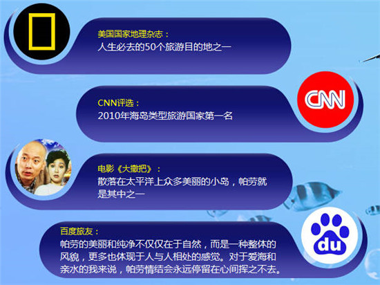 位于南太平洋上的帕劳,虽然仅286平方公里土地,就有7大世界唯一奇观、200多个潜水点、49个浮潜点、1500多种热带鱼类、700多种瑰丽珊瑚,如此得天独厚的自然环境,令我成为世界最佳潜水胜地。