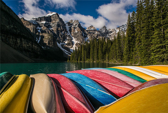 码头堆满了颜色多样的独木舟,周围是冰雪覆盖的山脉