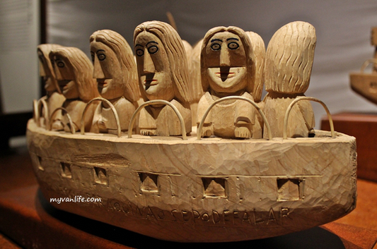 走进高大的博物馆,幽静深邃的走道两旁陈列着造型奇特、颜色斑驳的木雕,游客无声漫步在静谧神秘的氛围。往博物馆深处走去,各类原住民文物,诸如独木舟、面具等收藏一一呈现。风格朴实、造型逗趣,从斑斑斧痕与剥落的漆色中窥见原住民未被西方文明掠夺前那种自给自足、与世无争的生活态度。