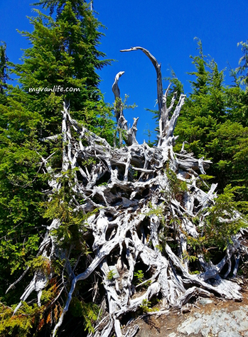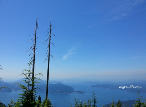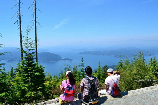 270度无障的视野尽揽豪湾风光:鲍温岛(Bowen Island)和甘比尔岛(Cambier Island)两座岛屿稳坐海湾内,船只在海上滑行,水上拖出一条长长的尾巴。远处是阳光海岸(Sunshine Coast)的山峦,一路绵延隐身海平面。山水相接,海天一色,将近一个小时攀爬纵走的酸疼在美景中消失殆尽。可惜15坪大小的平台毫无遮荫,除了我等一行人,另有其他族裔的旅客也不禁毒辣的太阳,躲在一旁有限的树丛阴影里乘凉。
