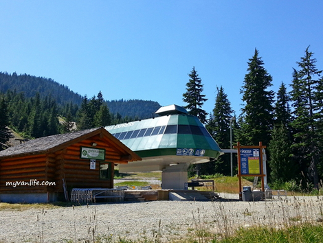 从空荡荡的游客中心出发,穿过红豆杉湖步道(Yew Lake Trail)林木高耸间小路,眼前是巨大的缆车车站。车站在绿油油的丛林间看似废弃的工厂机具,难以想像冬日里繁忙运转的景象。
