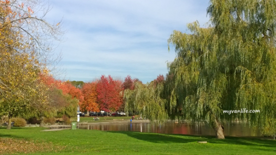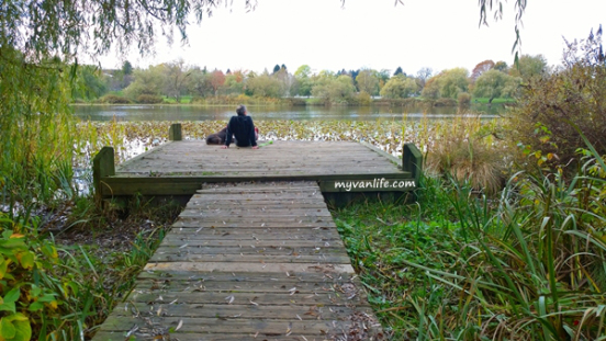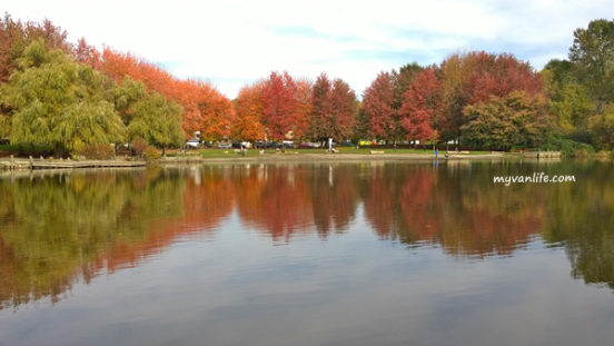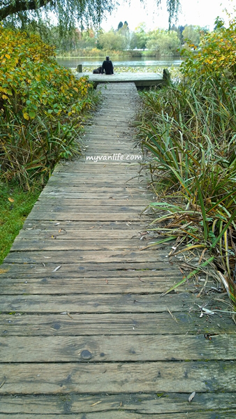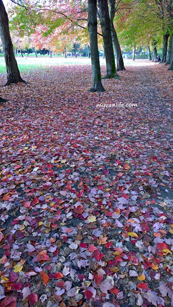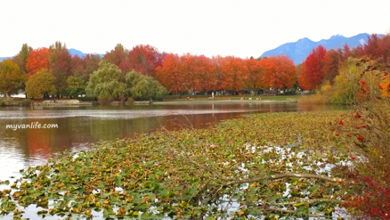一说是长形湖泊右腰间位置。走上湖边木栈平台,常见主人与爱犬相依偎,对着湖面发呆。往北沙滩望去,火红树冠依旧,但近湖岸荷叶凋零,对比之下煞是萧瑟。