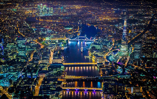 伦敦夜景,泰晤士河穿流而过,伦敦铁桥清晰可见