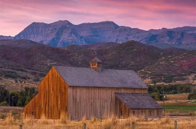 廷帕诺戈斯山(Mt. Timpanogos)的美丽日出和山脚下的历史建筑——泰特谷仓,位于米德韦(Midway)的这座谷仓是西部山区历史的见证。