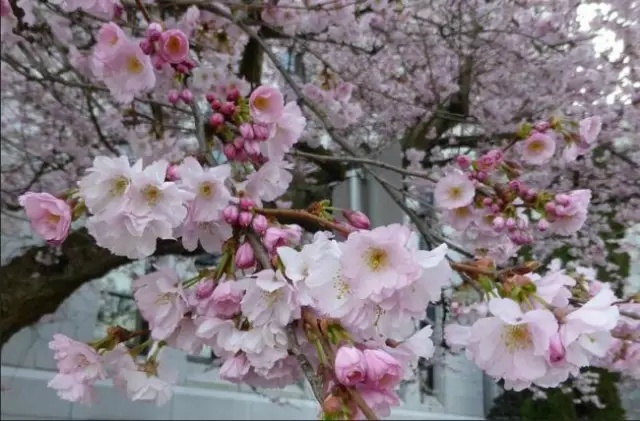 树形如伞的育空樱(Whitcomb),花形不大,绽放时为深桃红色,后期渐渐变淡转为偏白的粉红。