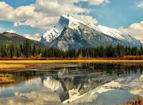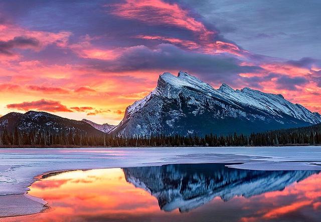 而画面中如明镜般纯净的美湖就是著名的朱砂湖(Vermilion Lakes)。朱砂湖距离班夫镇3公里,此处是日出最漂亮的地方,也是整个落基山最富盛名的摄影地之一。