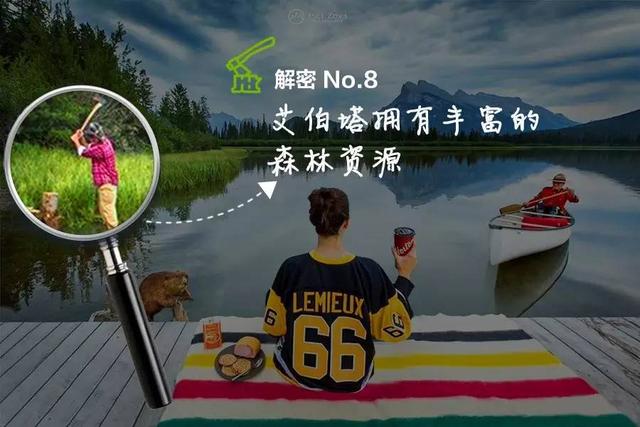 图片左上角的伐木人突出了树木在加拿大艾伯塔人生活中的重要性。加拿大人的生活是依仗着它的土地的,从辽阔的森林景观资源、到房屋建筑、冬季取暖等等加拿大人都离不开大自然馈赠的丰富的森林资源。