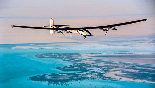 单座的Solar Impulse 2,计划在北美降落中途站稍事休息后,继续飞越北美洲,然后飞至欧洲,以及西亚的阿布达比(Abu Dhabi)。