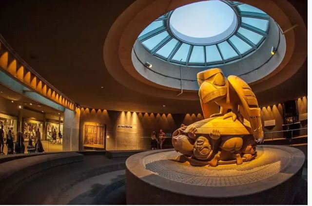到过这里的同学都知道,博物馆本身的建筑,就是一件艺术作品。博物馆由加拿大知名建筑师Arthur Erickson设计,以水泥和玻璃为主要的建筑材料,外形仿照的是加拿大西北海岸原住民的房屋结构,颇具特色又不失大气。而博物馆后方临海的广场,被图腾柱环绕,是个感受原住民文化的绝佳地。小编强烈建议在温哥华的小伙伴们可以来这座博物馆看看!