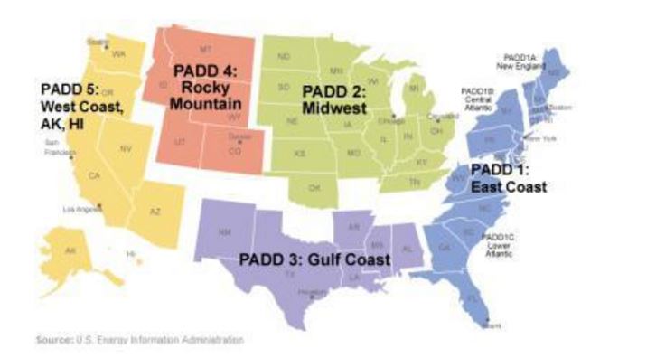 先解释一下图中的“PADD”序列。二战期间,美国联邦政府为了便于分配原油燃料,将50个州划分为5个行政区。自战后至今,美国能源部一直借用这套石油防御管理区划体系(Petroleum Administration for Defense Districts,简称PADD),描述国内原油市场的动态,其中PADD I代表东海岸,PADD II代