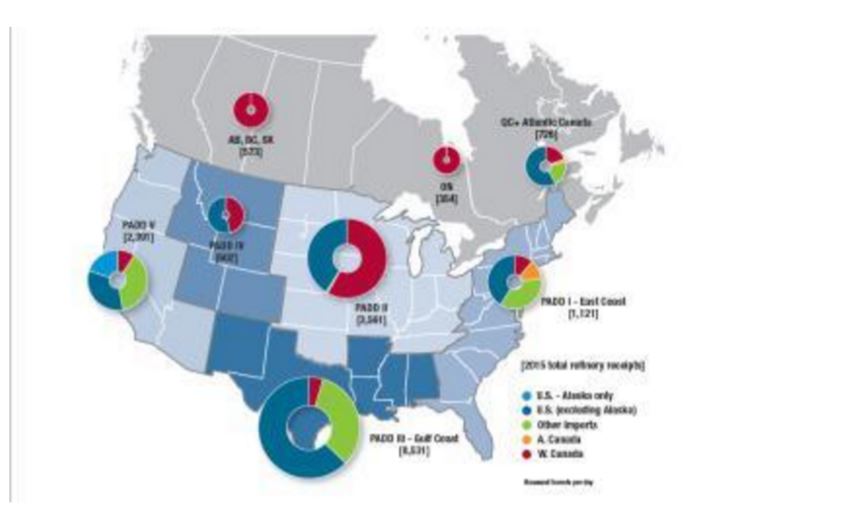PADD I代表的东海岸有9个精炼厂,每天可加工原油130万桶。2015年,这些精炼厂加工原油110万桶,近2/3来自国外。不过,加拿大原油在这里没有优势,只拥有25.7万桶份额,其中一半来自加拿大西部,一半来自加拿大大西洋近海。
