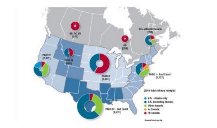 加拿大原油主要产自西部,所以接下来,我们主要结合各区域精炼厂的原油来源,分析加拿大西部原油的具体去向。