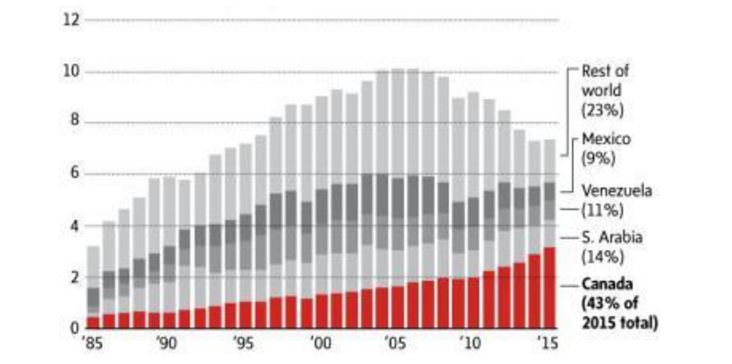 时至今日,加拿大已经成为美国第一大原油进口国。过去五年,美国从国外进口原油的总量持续减少,但是加拿大原油进入美国市场的数量,却一直保持增长。根据EIA数据,2015年美国平均每日进口原油740万桶,其中43%来自加拿大,14%来自沙特阿拉伯,11%来自委内瑞拉,9%来自墨西哥,23%来自其他国家。显然,对美国来说,沙特原油与加拿大原油相比,其重要性已经不可同日而语。