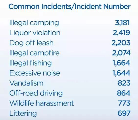 常见的违法行为包括在在允许的露营地之外支帐篷露营、不适当的地方喝酒,以及没有给宠物狗带狗链等等。