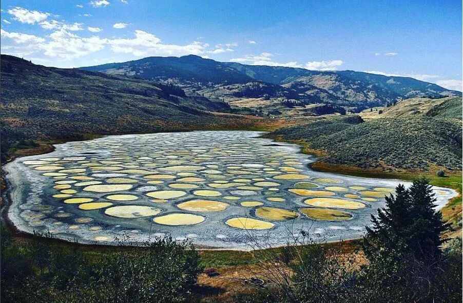 在附近还有闻名世界的奇景——斑点湖(Spotted Lake)。每年夏天,高温让大量湖水蒸发,湖底的矿物质也逐渐裸漏出来,形成许多白色镶边界线和浅池。随着阳光的角度,湖水变幻出不同的颜色,像极了画家的调色盘。