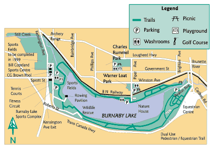 本拿比湖的步行路线一般是从Skytrain出来的运动场开始,走过橄榄球俱乐部(Rugby Club)大楼,草地上一条和大路平行的小径便赫然眼前,沿着这条小径一直走,草地尽头是一条碎石子路,它将带领你来到赛船馆。