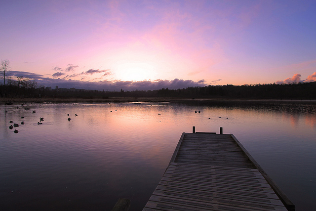 离开赛船馆后,沿着之前的石子路继续前行,沿途有小桥流水,美丽的湖面倒映着远处的北岸山脉。继续沿着湖的南面走,一段木板路将带你穿过沼泽区,本拿比马术中心(Burnaby Equestrian Centre)就在附近。