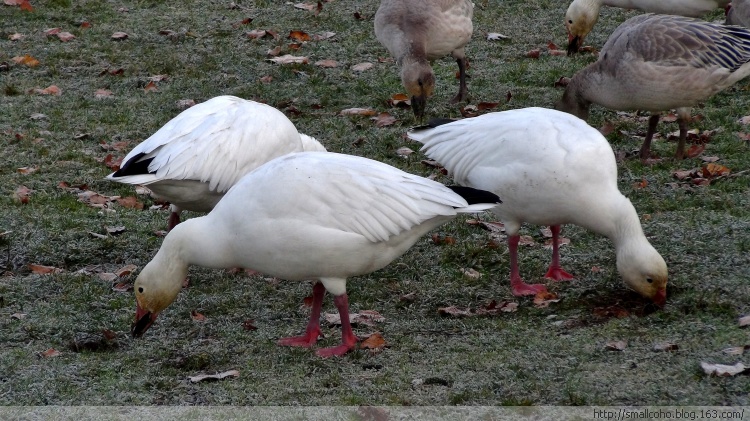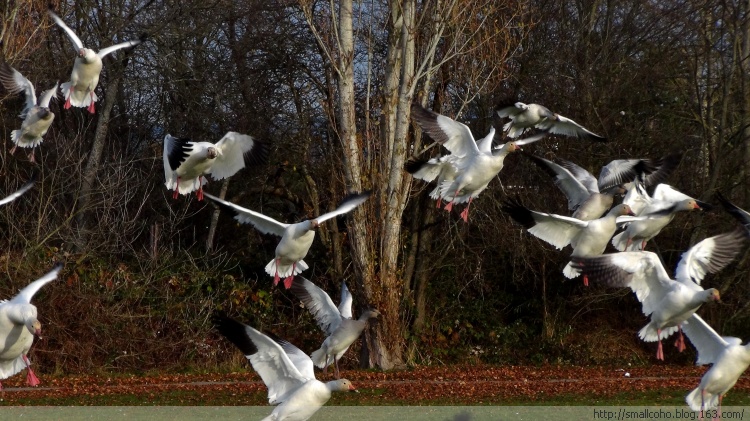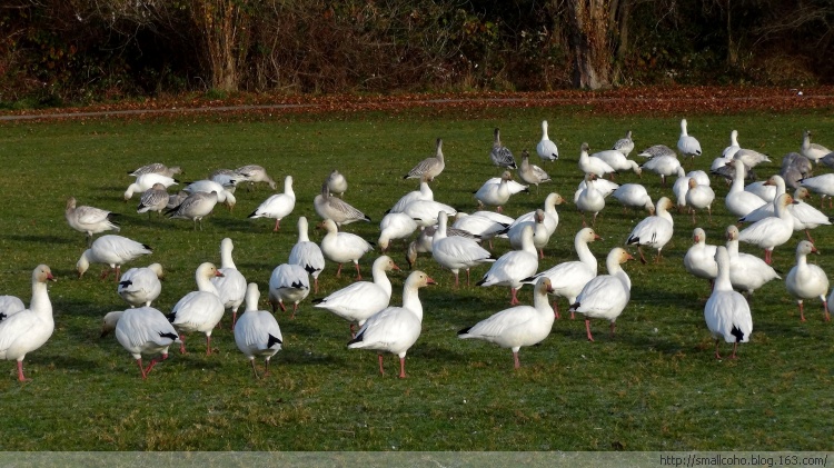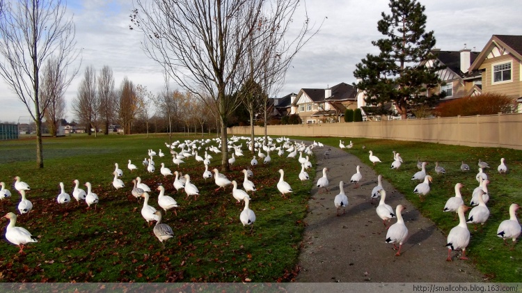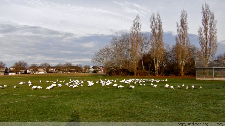 这几年,西部雪雁群里的很大一部分不再南下,而是停留在大温哥华地区越冬。越来越多的雁群,原来还大多只停留在三角洲市莱福野鸟保护区(Reifel Sanctuary)和列治文市西边海堤(Sturgeon Bank)外浅滩芦苇荡。现在则停留觅食在各市区的公园,学校里。雪雁过处,整片绿油油的草坪被连根刨起毁坏,遗留的大量粪便污染各个学区学校的地毯,带来疾病传播的隐患。雪雁问题已经成为大温各市长每年冬季面临的最头疼的问题之一!市区里面不能开枪,只能号召志愿者驱赶,但也只能在不同地点间赶来赶去而已,没有啥大的效果。找专业的Pest防治公司吧,又要花掉纳税人的钱,民众都不答应。呵呵,所以说生态需要平衡,环境太好了也有自己的麻烦。