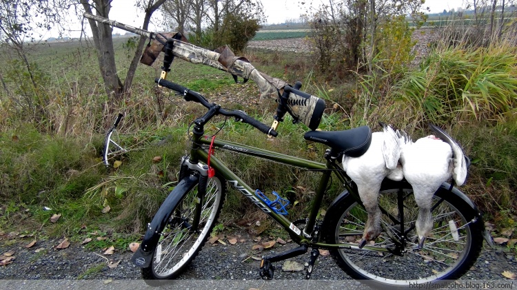 虽然很不容易打到,但打雪雁也是猎人们一项很不错的活动,能不能打到,移动速度很重要,因为雁群的飞行路线很多时候是当天固定的,一旦发现雁道就要尽快赶过去。我们打猎这一片儿猎区堤坝长度8公里,靠腿肯定是不行的,就用这人力环保战车了。半天下来的跑动量也不小,对身体是个很好的锻炼。。。。
