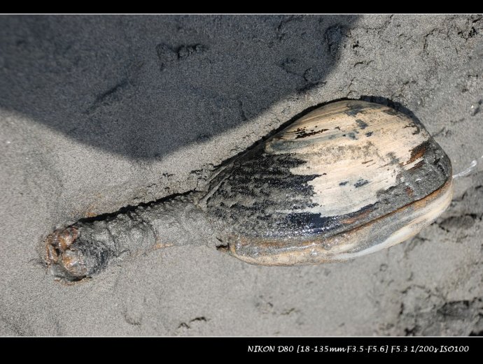 我们在朋友的带领下在海滩上寻找直径4-5厘米的气孔,据说气孔越大,埋在下面的象拔蚌个头越大。有的象拔蚌索性把鼻子伸到沙子上边一点点,仔细看都能看到它的鼻子头!