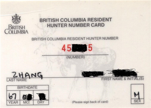 要在BC省打猎,必须先拿到BC Hunter Number Card. 这个猎人号码,是你终身拥有,除非你触犯狩猎有关的法律。你有了猎人号码,你就可以到体育商店购买猎证。你还需要购买猎物票-Tag,想打黑熊,就买黑熊票。这些过程,对新手来说,很复杂。但不要急,我会给你慢慢讲来。你很快就会对BC狩猎有初步的了解了。