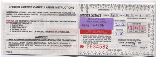 这是猎证里面的一页。那个紫色的矩形标签,是黑熊票,官方说法就是 Black Bear Tag。价格是16块钱许可费用,4块钱 动物环保基金,1块钱联邦税。购买日期是2013年4月1日。因为BC省的狩猎季节是从4月1日到下一年的3月31日。所以,即使你不是在季节开始的第一天买,商店职员也会图省事,写上4月1日。这里有几个例外,我只举一个例子。如果你买美洲狮Cougar的票, 他们就会按照你实际购买时间填上。因为BC省规定,美洲狮必须在你购票后两天后才能打。