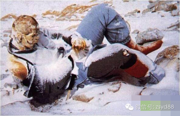 这是因为高空坠落而死亡于1924年的玛洛里(George Mallory)的尸体。1924年,英国第三支珠峰登山队(队长弗·诺顿),从中国境内的珠峰北坡登山,当诺顿等人到达北坡“第二台阶”下边的8572米附近时,因氧气不足而被迫下山,队员玛洛里和阿宾坚持继续前进,一去未返。后来人们在山脚下找到了玛洛里的遗体,他是从山崖上坠落下来而死的。