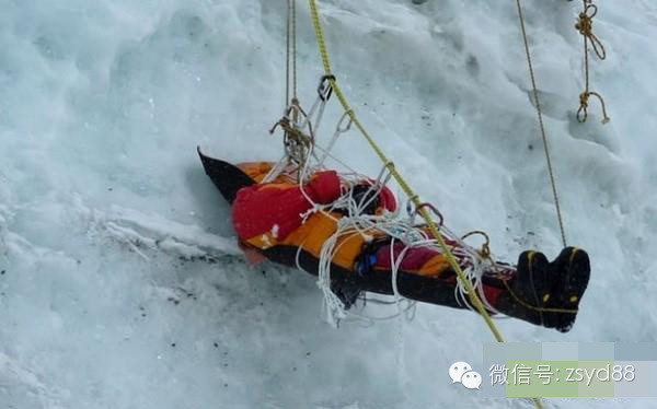 这是一位悬吊在冰崖上被活活冻死的登山者,使用冰钩和绳索攀登90°的冰崖往往是攀登者遇到的最大的阻碍。有时候只要一个很小的失误,就会让攀登者上也上不得、下也下不得,最后吊在那里被活活冻死。