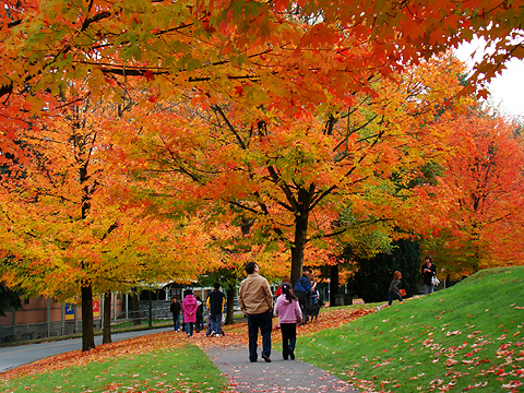 离中央公园很近的Burnaby图书馆,每到10月下旬,枫叶就变成艳丽的火红色,鲜艳夺目。另外离中央公园只有一路之隔的Patterson天车站,几栋高层旁的枫叶总会让人眼前一亮,在这里赏玩枫叶后,还可以到公园里走走,何乐而不为呢。