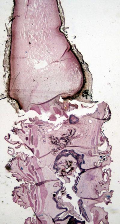 我将冬虫夏草制成切片,到显微镜下观察一下。(见图3、图4)