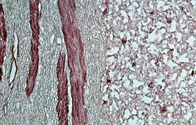 图4:红色是虫体的肌肉(平滑肌),浅蓝色竹节样细丝是霉菌菌丝