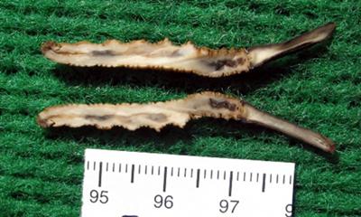 通过关系,我弄到了几根真正的冬虫夏草,外表及切开后的剖面如下图(1、2)。