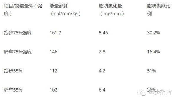 首先说跑步和骑车。研究发现①,同等强度下。跑步消耗热量,本身就比骑车高很多。另外,脂肪的消耗和脂肪的供能比例,也高很多。