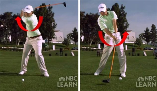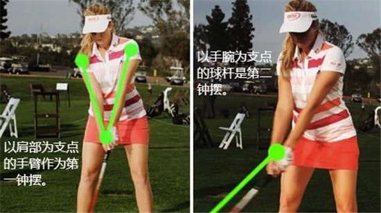挥杆过程中会形成两个钟摆效应:以肩部为支点的手臂形成一个钟摆,以手腕为支点的球杆形成另一个钟摆。若两个钟摆能够协调运动,球杆所形成的第二钟摆在击打小球前自然释放,那么击球时下杆的力量就能转移到小球,让击球水到渠成。