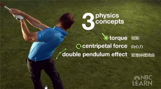 扭矩是改变物体旋转速度的转动力量。在挥杆过程中,上杆时的肩部转动和下杆时的臀部转动都是扭矩发挥作用的形式。根据公式扭矩=扭力×力臂长度,即力臂越长,扭矩越大,因此在上杆转身时,通过转动肩膀增加力臂长度,可获得更大的挥杆力量;同理,在下杆时,转动臀部,所产生的扭矩就更大,使挥杆速度更快,击球距离更远。总的来说,延展身体,提升转动幅度,则扭矩越大,击球的速度和力量也就越大。