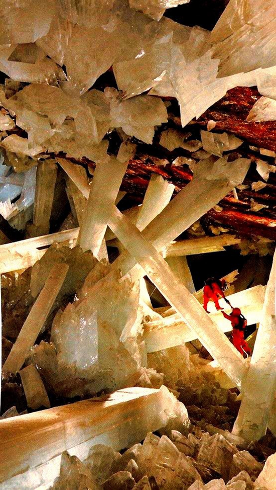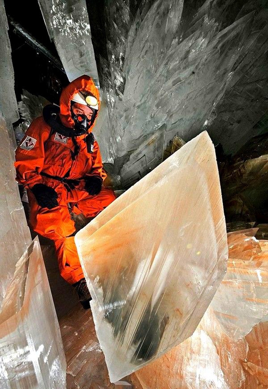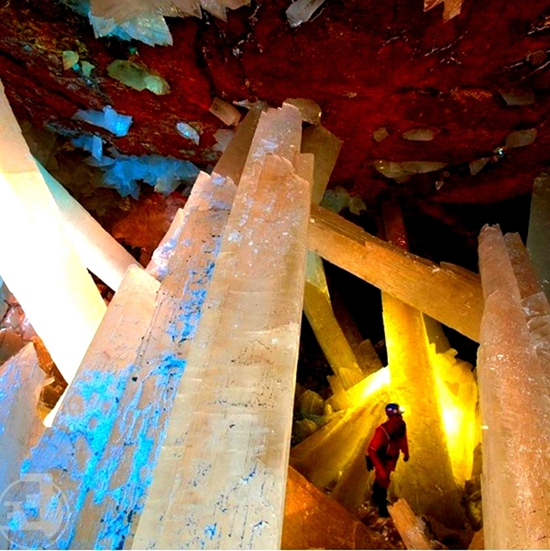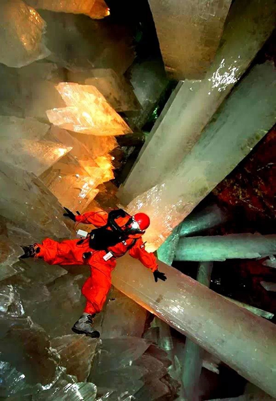 ▶奈卡水晶洞(Cave ofthe Crystals):世界上最大的地下水晶洞穴,位于墨西哥奇瓦瓦沙漠奈卡山脉一带,奈卡水晶洞洞深达274米,洞内到处都是壮观的发光巨型石柱,有松树那么高,全部为半透明的金色和银色。晶体的形状令人惊叹叫绝。这些洞穴,在这闷热(50摄氏度)潮湿的环境中,人类在里面活动超过10分钟会有生命危险,所以需要穿有高科技冷却功能的防护衣,才能进入洞穴里。