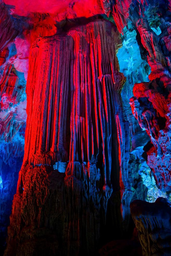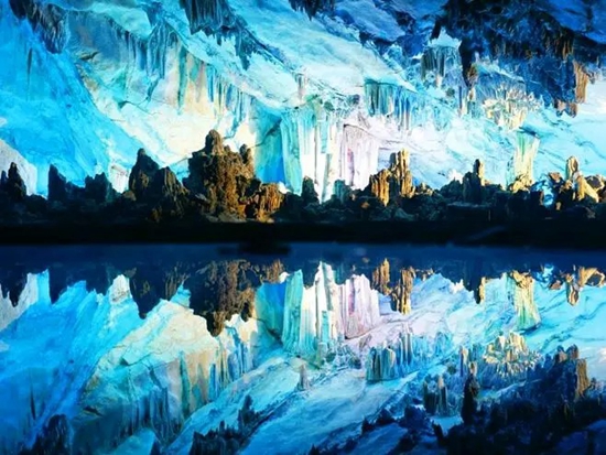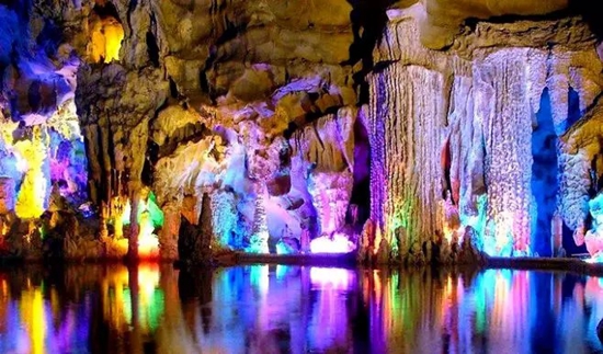 ▶芦笛岩(Reef FluteCave):位于桂林市西北桃花江畔,是中国最美的溶洞之一。洞内奇麓多姿、玲珑剔透的石笋、石乳、石柱、石幔、石花,琳琅满目,组成了狮岭朝霞、红罗宝帐、盘龙宝塔、原始森林、水晶宫、花果山等景观,令游客目不暇接,如同仙境,被誉为“ 大自然的艺术之宫 ” 。从唐代起,历代都有游人踪迹,现洞内存历代壁画 77 则。自 1959 年发现并开发后,如今已建有餐厅、茶室、水榭、湖池、曲桥,并设游船,广植花木,成为中外游客游览桂林时必至的旅游热点。