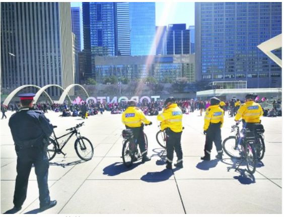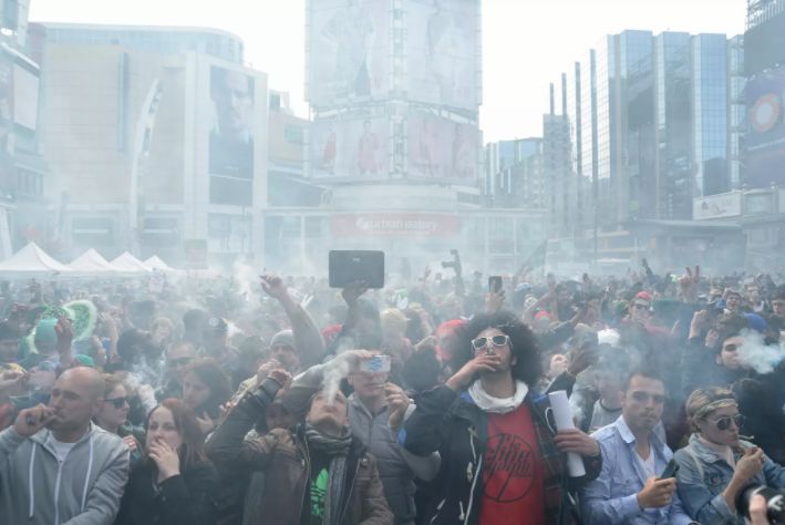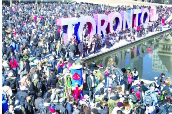 活动在多伦多市政厅大楼前的弥敦菲腊广场上举行(没有许可),数以千计的哈草者和他们的支持者,挤满了整个广场吞云吐雾,浓烈的大麻味隔着很远都能闻到。