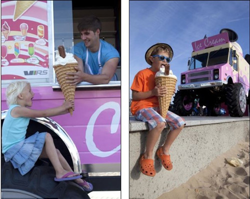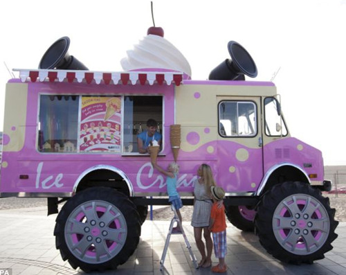 英国大雅茅斯海滩上的游客们是该卡车第一批发放免费冰淇淋的对象。因为该卡车过于高大,孩子们只有站上梯子才能接得住服务员递过来的巨型冰淇淋。随后卡车还会去往伯恩茅斯、纽伯里等地,预备发放6500份免费冰淇淋。