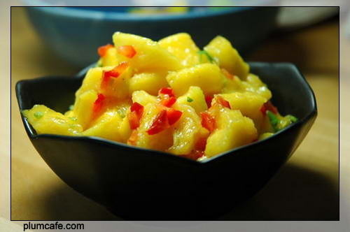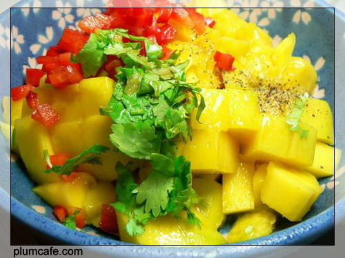 3)把红椒,香菜切碎,倒入装芒果丁的碗里,撒一匙柠檬汁,加点儿胡椒粉,如果不讨厌芝麻油的味道的话,还可以再滴几滴芝麻油。