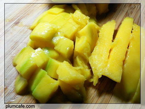 1)把芒果肉切成小块儿。