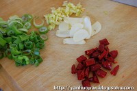 3.干辣椒切小段,蒜切片,葱姜切小粒备用